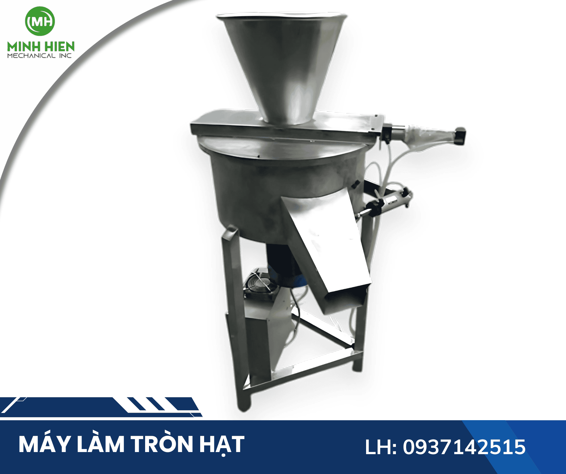 Máy làm tròn hạt: sau khi máy đùn, đùn ra sợi thì rơi vào máy làm tròn hạt máy làm tròn hạt sẽ vo cho hạt tròn trong thời gian khoản 30s sau đó máy mở cữa cho hạt ra ngoài